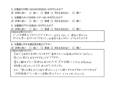 また、「愛犬の骨をすべて持ち帰りたい」という飼い主のわがままにもかかわらず、ご担当者様がていねいにお骨を拾って下さりとてもうれしかったです。