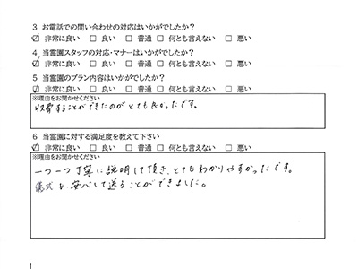 ・満足度を教えてください:【非常に良い】 一つ一つ丁寧に説明していただき、とてもわかりやすかったです。 儀式も安心して送ることができました。