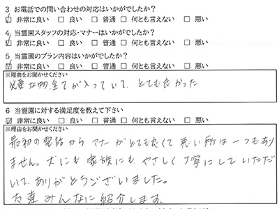 ・満足度を教えてください:【非常に良い】 最初の電話からマナーがとても良くて悪い所は一つもありません。 犬にも家族にもやさしく丁寧にしていただいてありがとうございました。 友達みんなに紹介します。